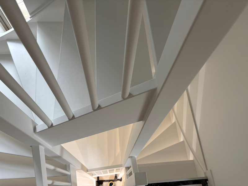 Op elke ondergrond spuiten wij altijd twee lagen latex en impregneren wij het stucwerk om de zuiging van de plafonds en wanden op te heffen. In het afplakken en maskeren van alle kozijnen, ramen, trappen etc. gaat veel tijd zitten. Dit is tevens een secuur werk omdat er strak gewerkt moet worden langs raamkozijnen en deurposten.